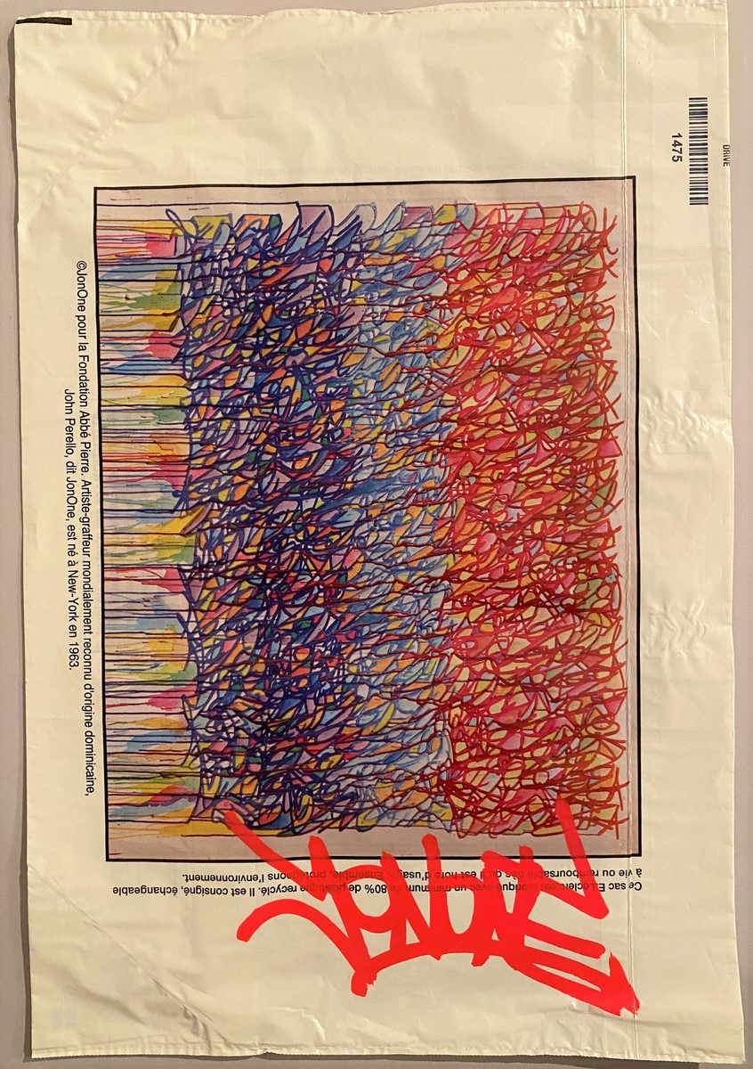 Sac en plastique de la Fondation Abbé Pierre créé par JonOne pour Leclerc en 2018 pour la collecte de fonds de la fondation.