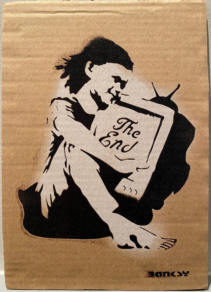 Art gratuit de la peinture en aérosol au pochoir semé au parc à thème de Banksy « Dismaland » qui s’est tenu pendant deux mois, d’août à septembre 2015. Pendant la période d’exposition, Dismaland a organisé un Art Libre où ils cachent l’œuvre à divers endroits et vous pouvez l’emporter chez vous. (Certains dommages sur le carton en sont la cause.) Livré avec ticket original d’entrée et Map Dismaland.