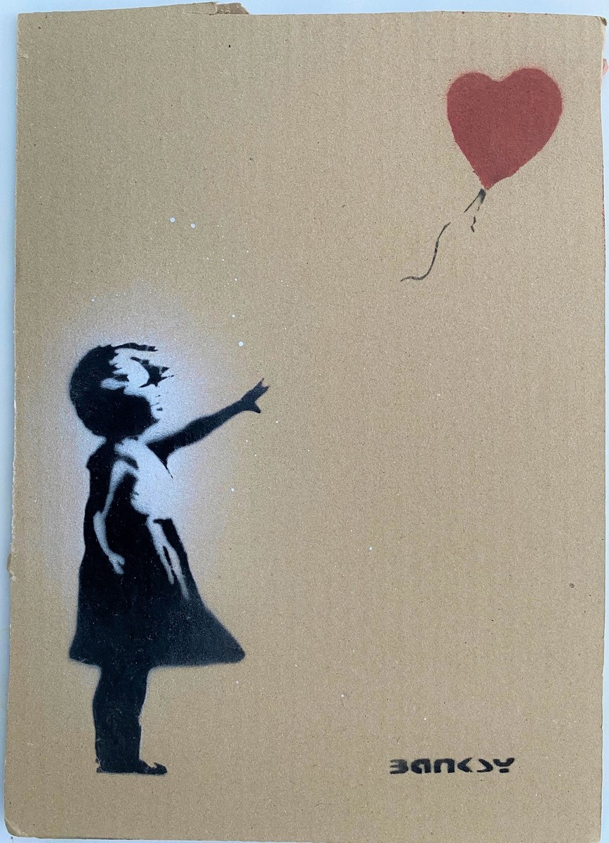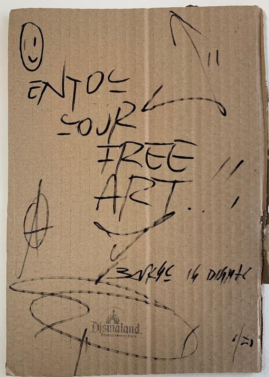 Art gratuit de la peinture en aérosol au pochoir semé au parc à thème de Banksy « Dismaland » qui s’est tenu pendant deux mois, d’août à septembre 2015. Pendant la période d’exposition, Dismaland a organisé un Art Libre où ils cachent l’œuvre à divers endroits et vous pouvez l’emporter chez vous. (Certains dommages sur le carton en sont la cause.) Livré avec ticket original d’entrée et Map Dismaland.