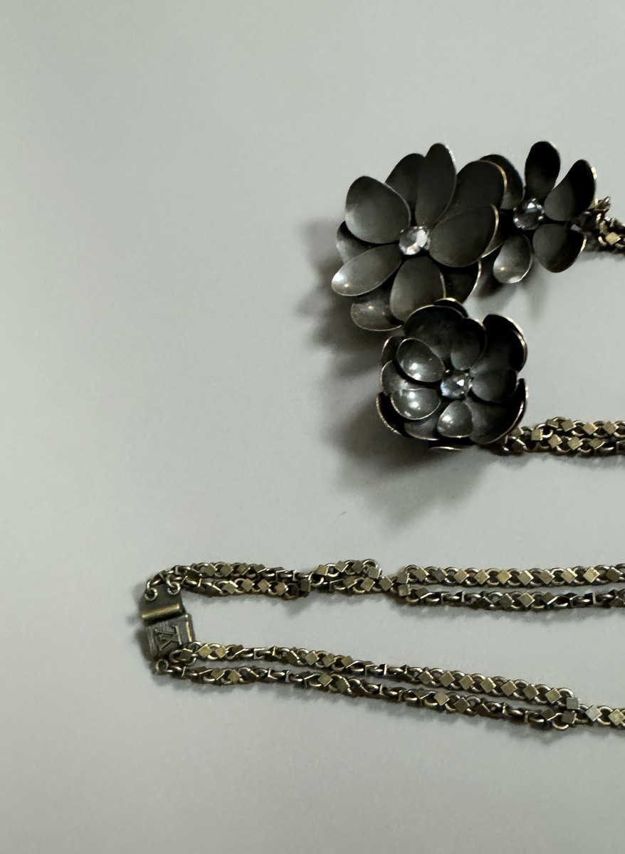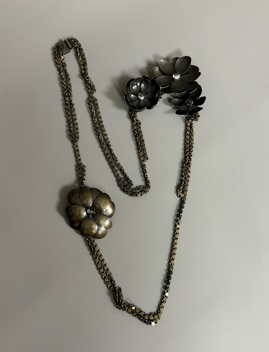 LOUIS VUITTON. SAUTOIR en métal et pierres d’imitation, à décor floral. Signé.