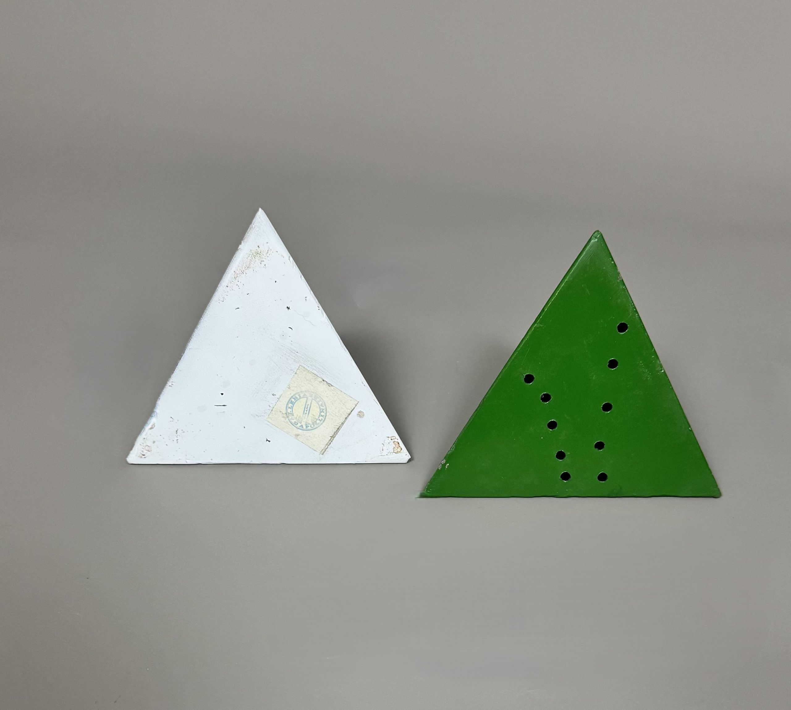 Lucio FONTANA (1899-1968) Attribué à. Deux pyramides en métal peinte blanche et verte, ajouré de cercles épars. Épreuve d’artiste portant une signature. Etiquette Galleria Appolinaire à la base. Edition Sergio Tosi, Milan. Époque XXème siècle.