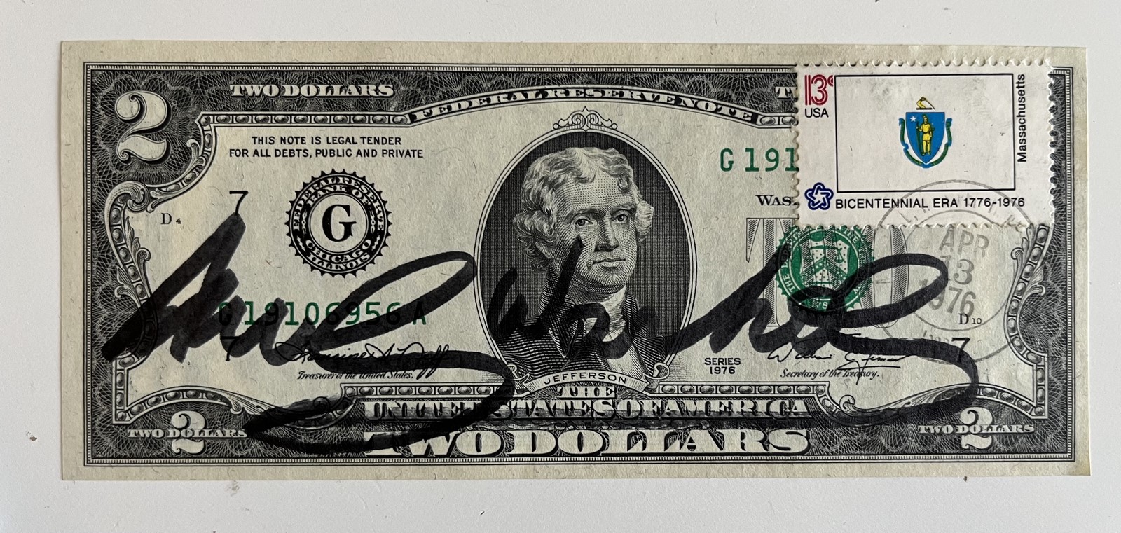 Billet de 2$ Jefferson de 1976, signé au feutre sur la face, timbré et tamponné par la poste américaine.