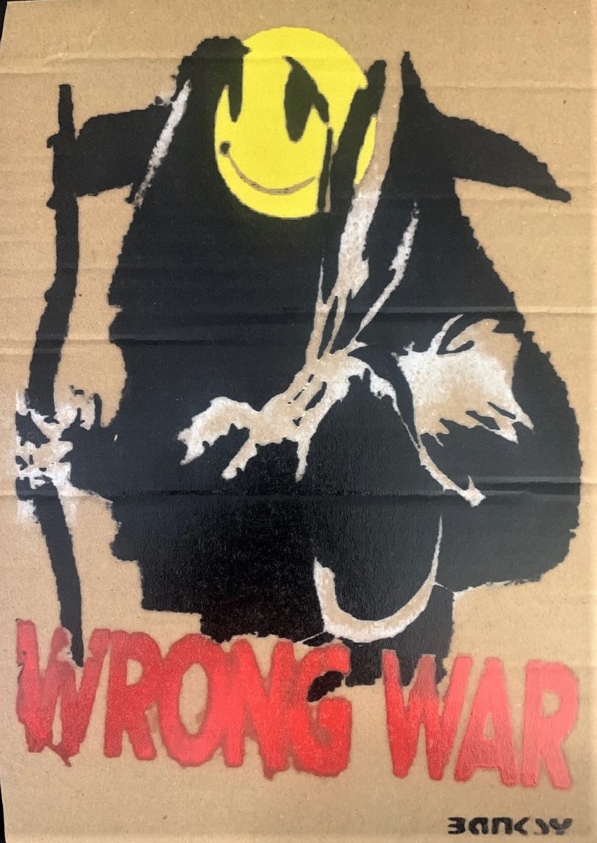 Art gratuit de la peinture en aérosol au pochoir semé au parc à thème de Banksy « Dismaland » qui s’est tenu pendant deux mois, d’août à septembre 2015. Pendant la période d’exposition, Dismaland a organisé un Art Libre où ils cachent l’œuvre à divers endroits et vous pouvez l’emporter chez vous. (Certains dommages sur le carton en sont la cause.) Livré avec ticket original d’entrée et Map Dismaland.