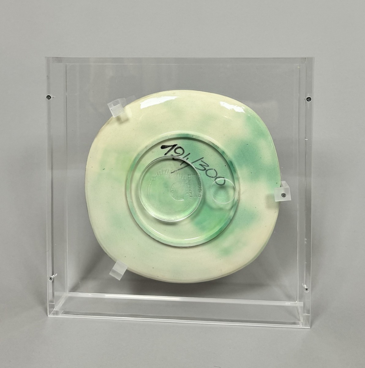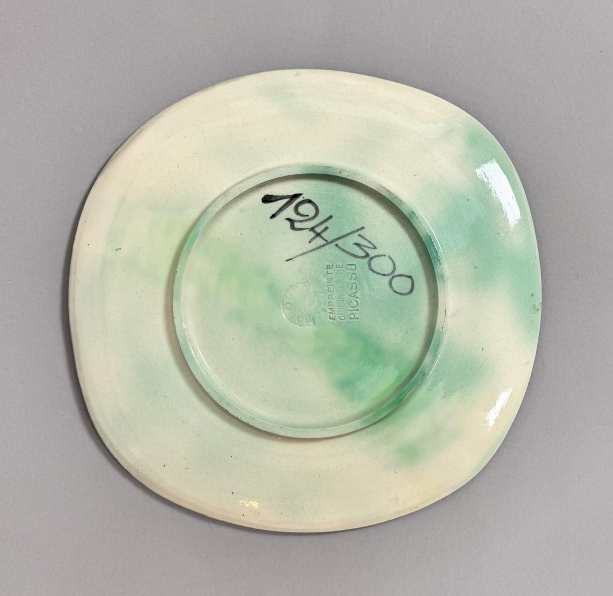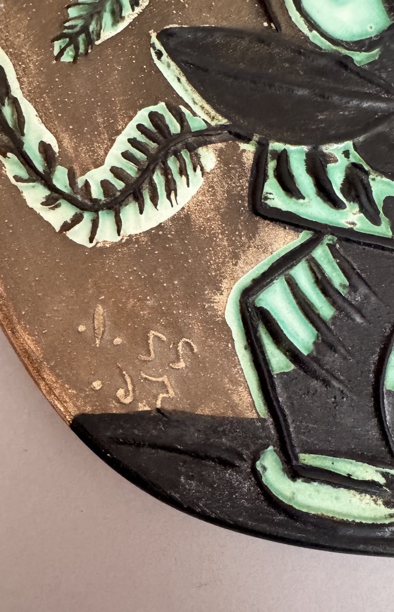 Terre de faïence blanche à décor incisé et peint d’oxydes métalliques sur émail noir, Marques en creux dessous : ‘Madoura Plein Feu’ et ‘EMPREINTE ORIGINALE PICASSO’ et Daté 29.1.55 et numéroté 124/300.
