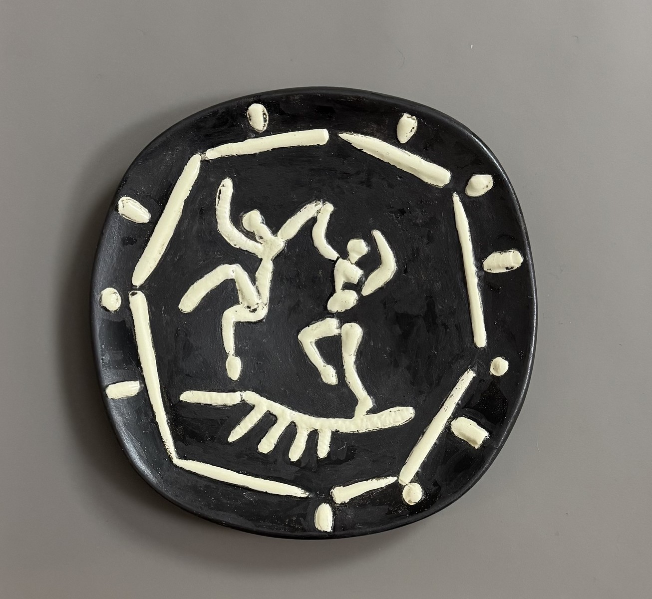 Assiette ronde carrée. Empreinte originale. Terre de faïence blanche. Gravure soulignée de couverte, fond patiné noir. Décor ivoire et brun. Édition à 450 exemplaires. Cachets creux “Madoura Plein Feu” et “Empreinte originale Picasso” dessous.