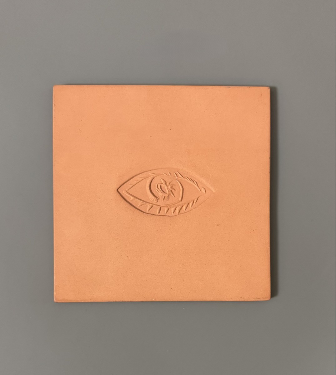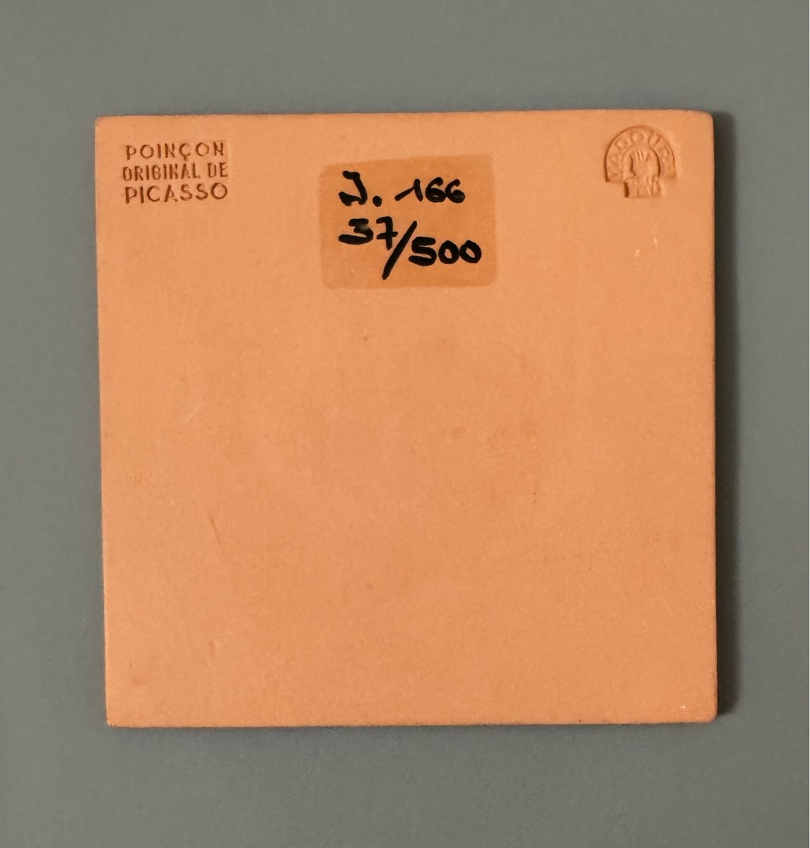 Carreau en terre de faïence rouge, Porte au dos les cachets en creux « Poinçon original de Picasso » et « Madoura plein feu ». Porte au dos l’inscription J. 166. Numéroté « 37/500 » au dos.