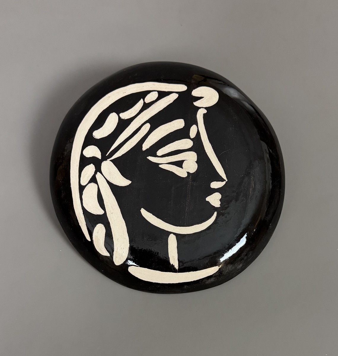 Plaque murale. Terre de faïence blanche, gravure soulignée de couverte, fond patiné noir. Cachets en creux « Madoura Plein Feu » et « Empreinte originale de Picasso ». Édition à 500 exemplaires non numérotée. Modèle créé en 1956. ;