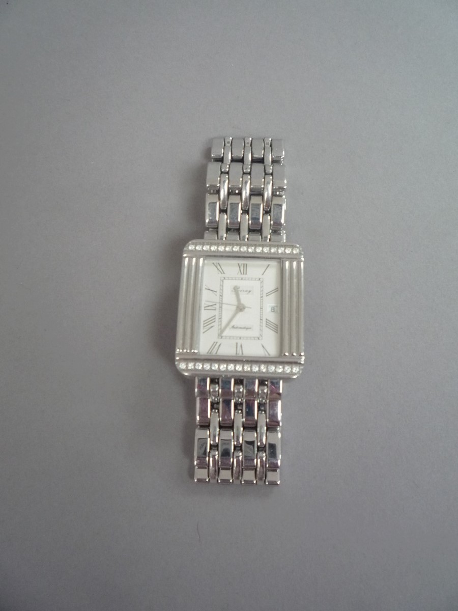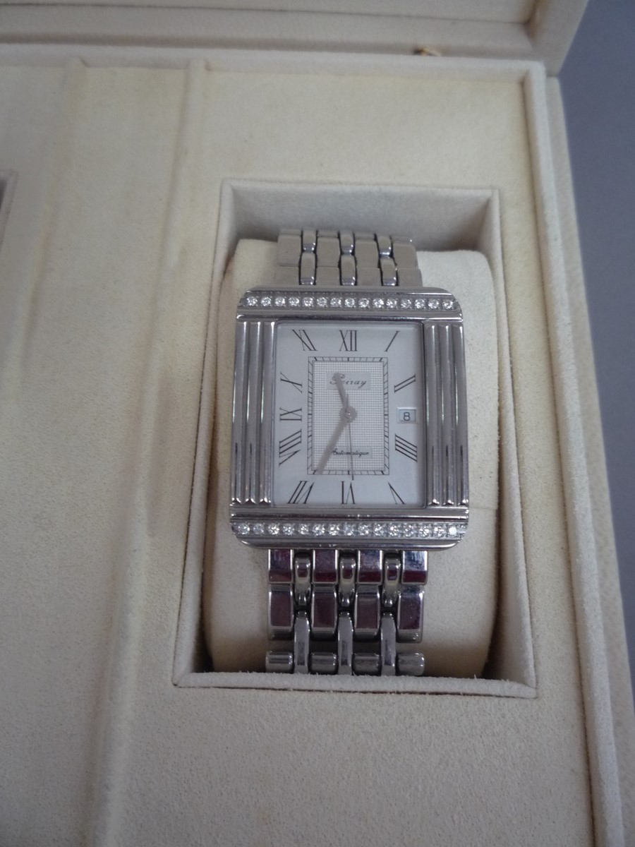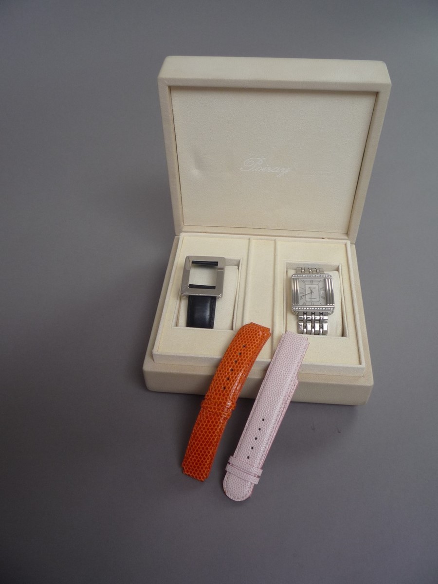 Bracelet acier, boucle déployante. Dans son écrin d’origine. Trois bracelets en cuir de rechange , et quelques maillons (T.20). En état de fonctionnement.