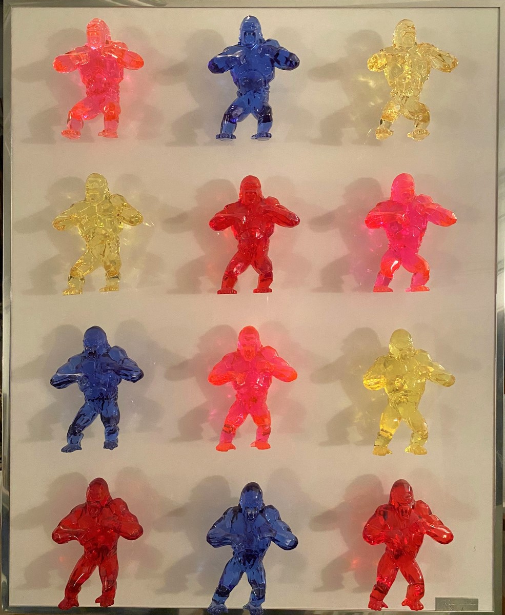 Sculpture-tableau en résine, epoxy crystal et aluminium, supportant 12 figurines en epoxy crystal , signé et numéroté sur une plaque EA 1/4