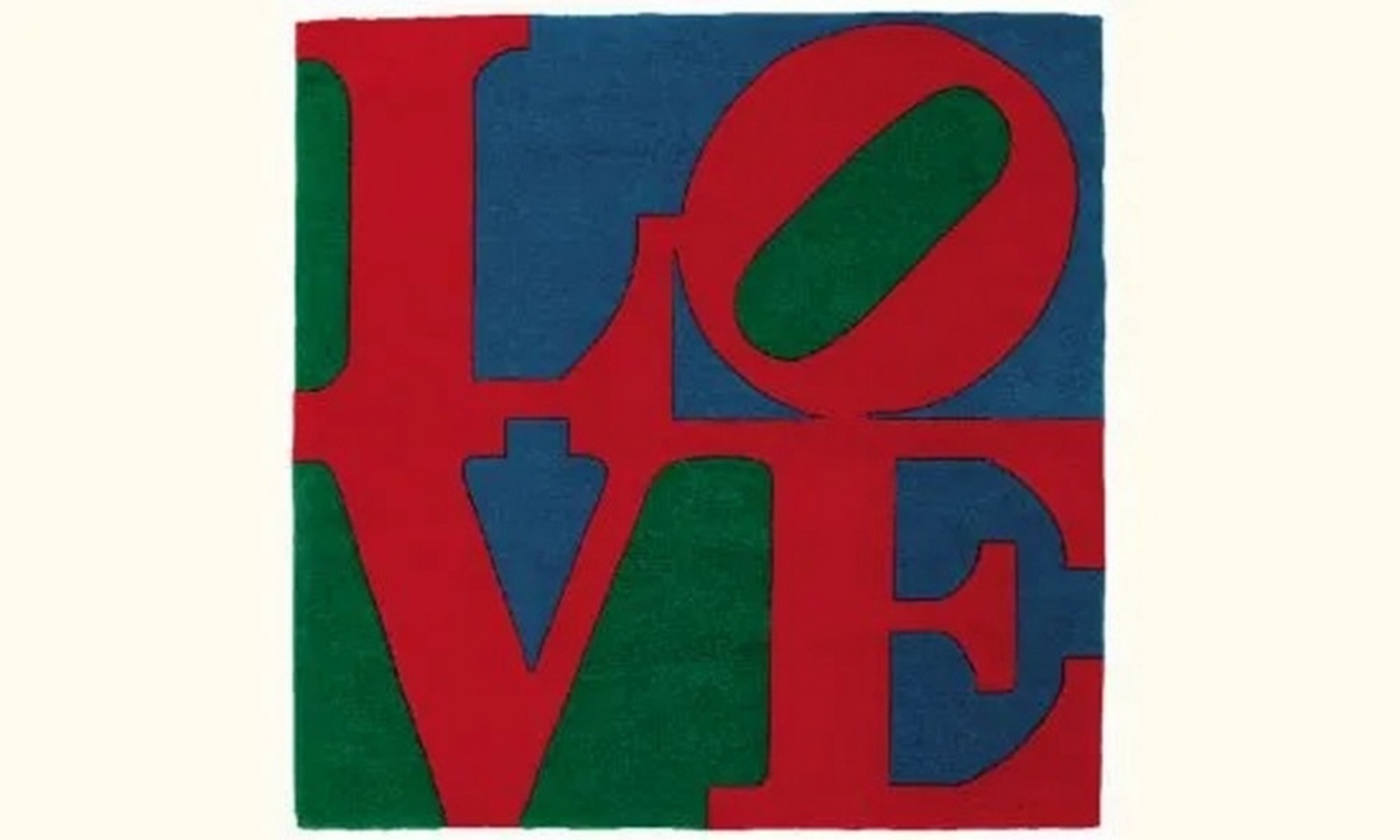 Tapis en laine, Love rouge sur fond bleu et vert. Signé « Robert Indiana » en bas à droite dans la trame. Signé « Robert Indiana » à la main au feutre sur le bolduc. Numéroté 102/150 au feutre sur le blocus au dos.
