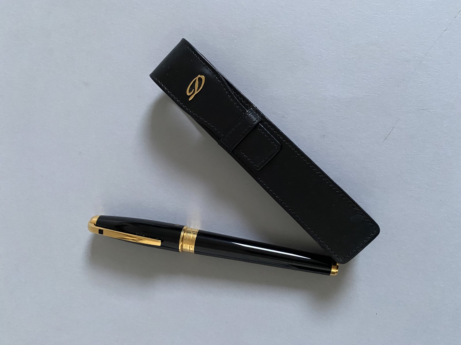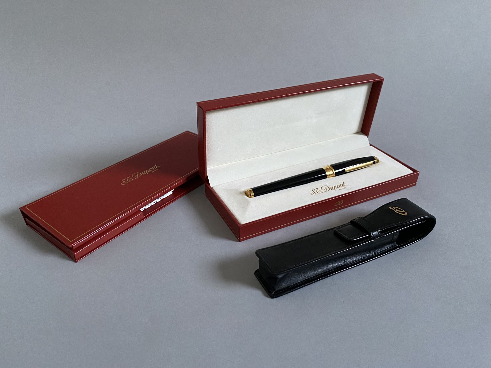 Stylo-plume en métal doré et laque de chine noire, Accompagné de son écrin, étui en cuir et certificat. Longueur : 13.5cm