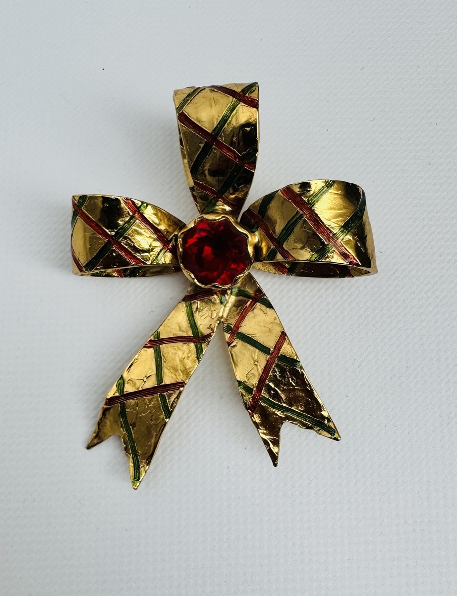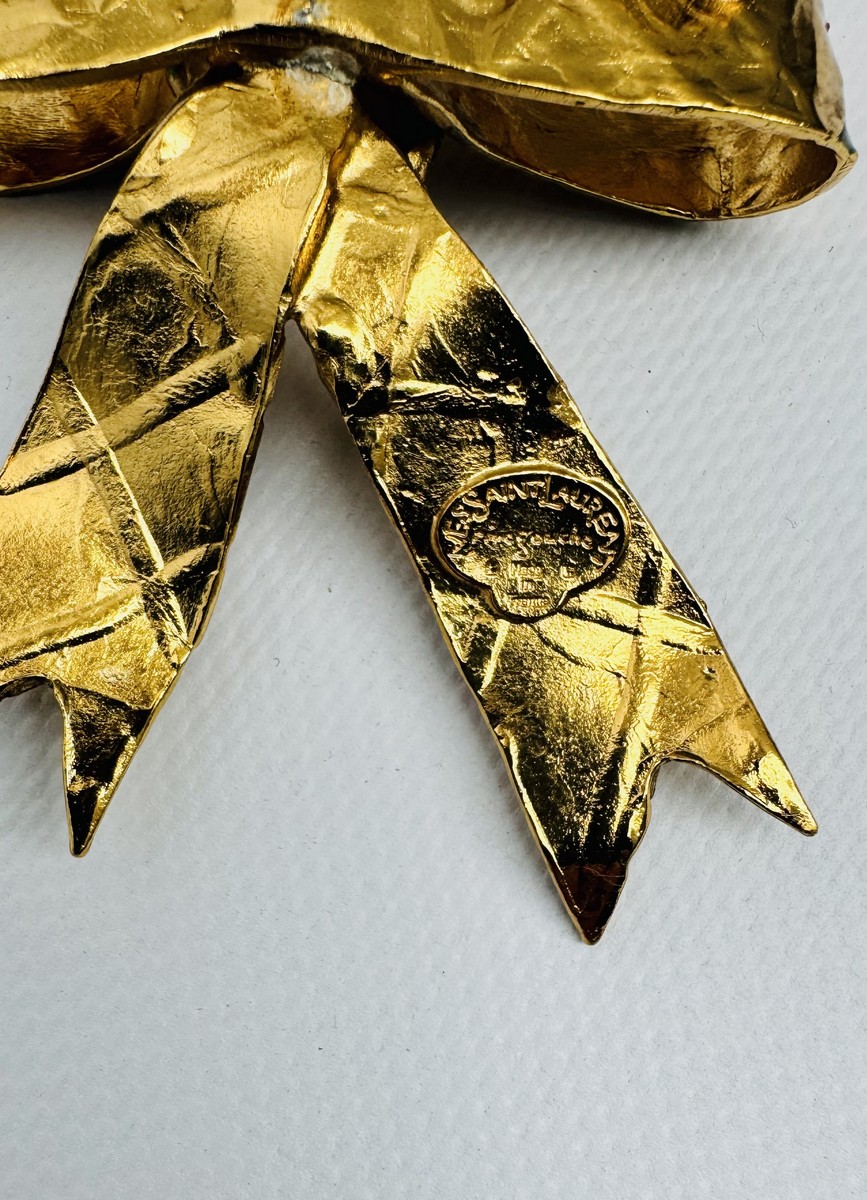 Lot 9 - SAINT LAURENT RIVE GAUCHE Broche-pendentif en métal doré, ciselé et strass, figurant un nœud. Signé.