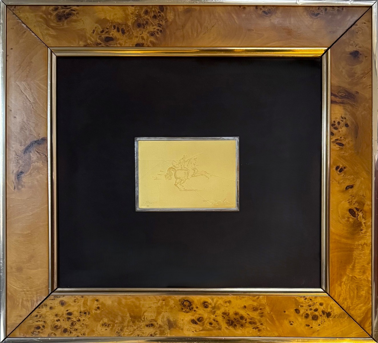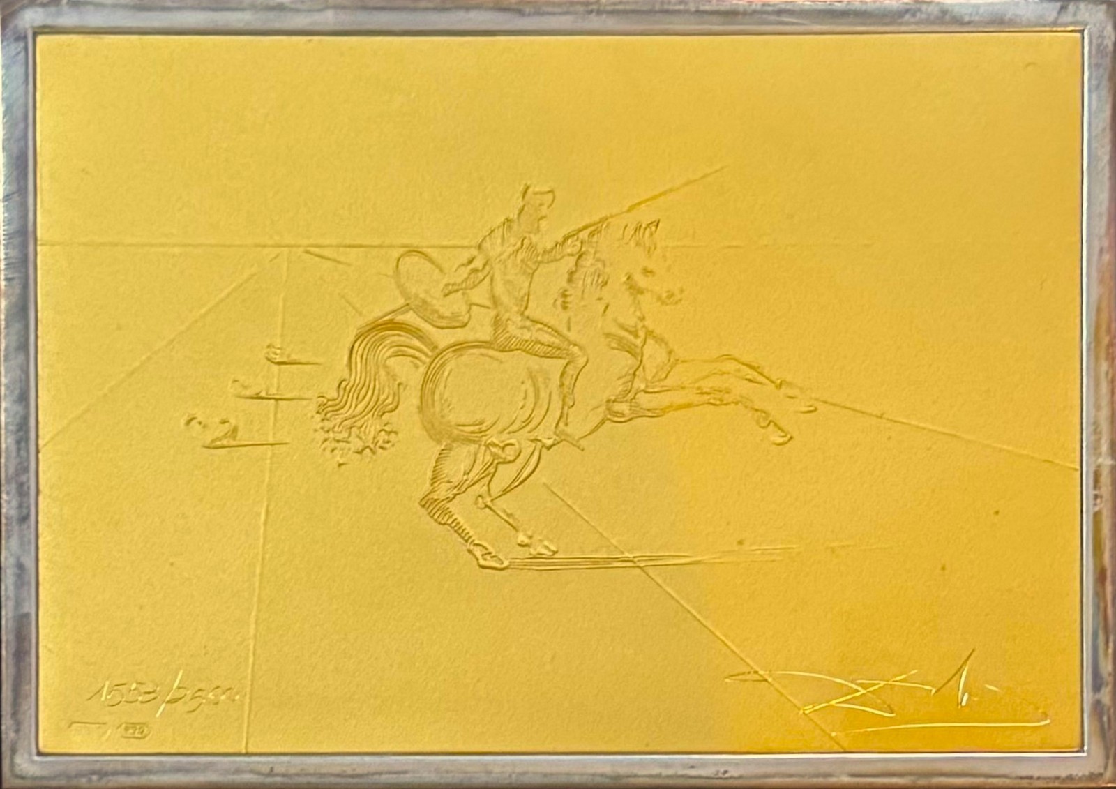Gaufrage d’un dessin de Dali d’un cavalier sur une feuille d’Or pur titré 990/1000 entourée d’un cadre en argent. Signée « Dali » à la mine de fer. Numérotée 285/2500 en bas à droite. Poinçon de l’éditeur Poinçon de l’or 999 dans un losange. Dimensions de l’œuvre : 7,3 x 10,2 cm.