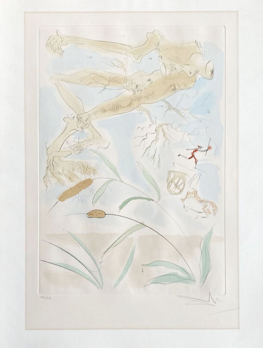 Pointe-sèche et pochoir original sur papier, signé au crayon et numéroté 198/250. Extrait du portfolio « Le Bestiaire de La Fontaine dalinisé ». Editeur : Robert Mouret, Editions des Maîtres Contemporains, 1974. Réf. : Michler-Löpsinger 653-664. Bon état, 76 x 57 cm.
