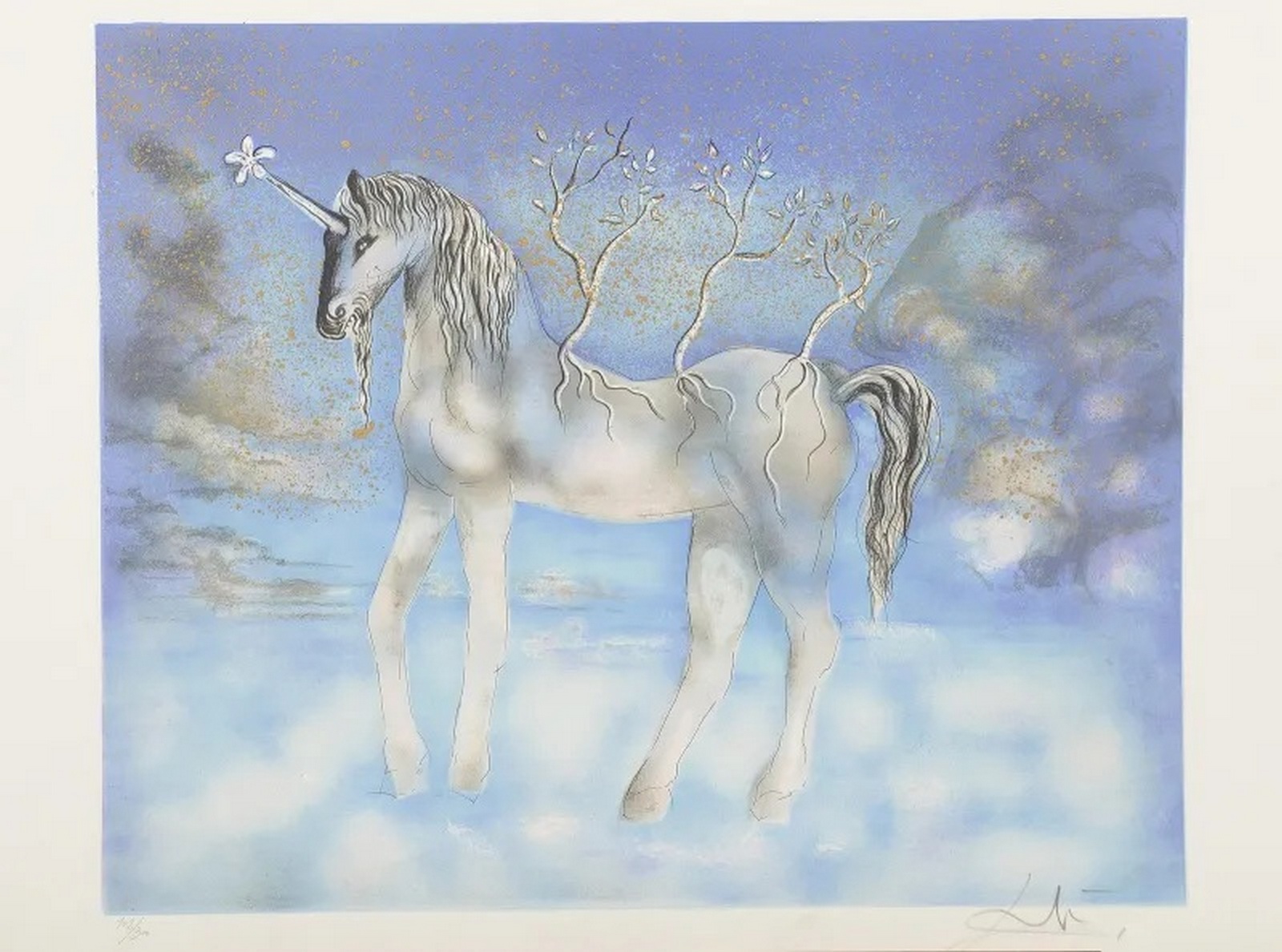 Salvador DALI (1904-1989)La licorne bleue. Lithographie en couleurs sur papier Vélin d’Arches , signée au crayon en bas à droite et numérotée 68/300 en bas à gauche.Timbre sec Salavdore Dali. 54,5 x 75,5 cm
