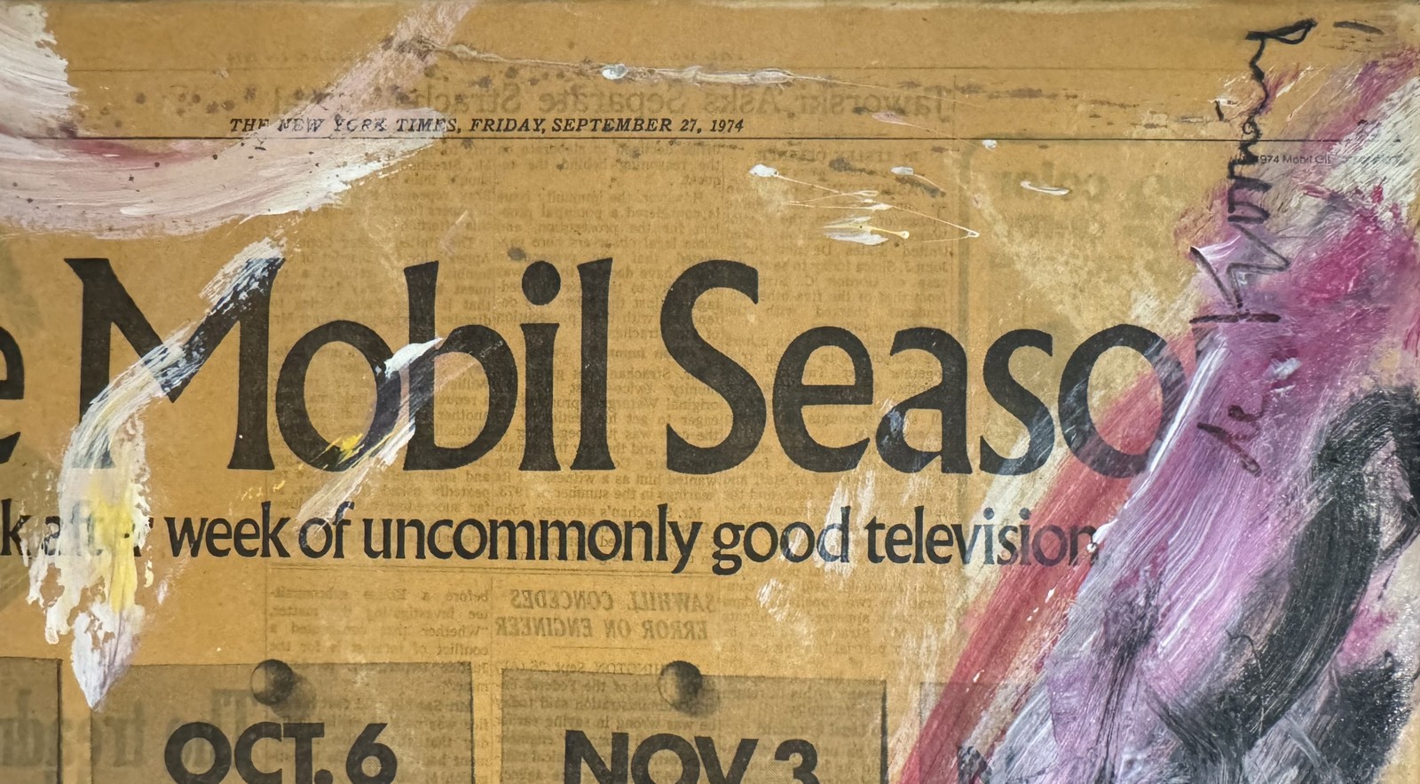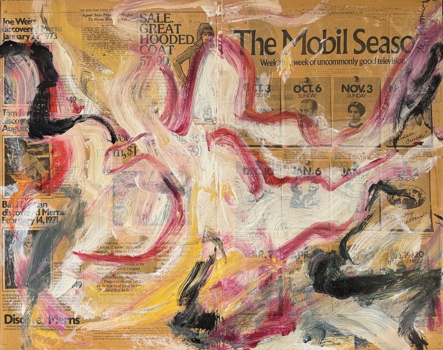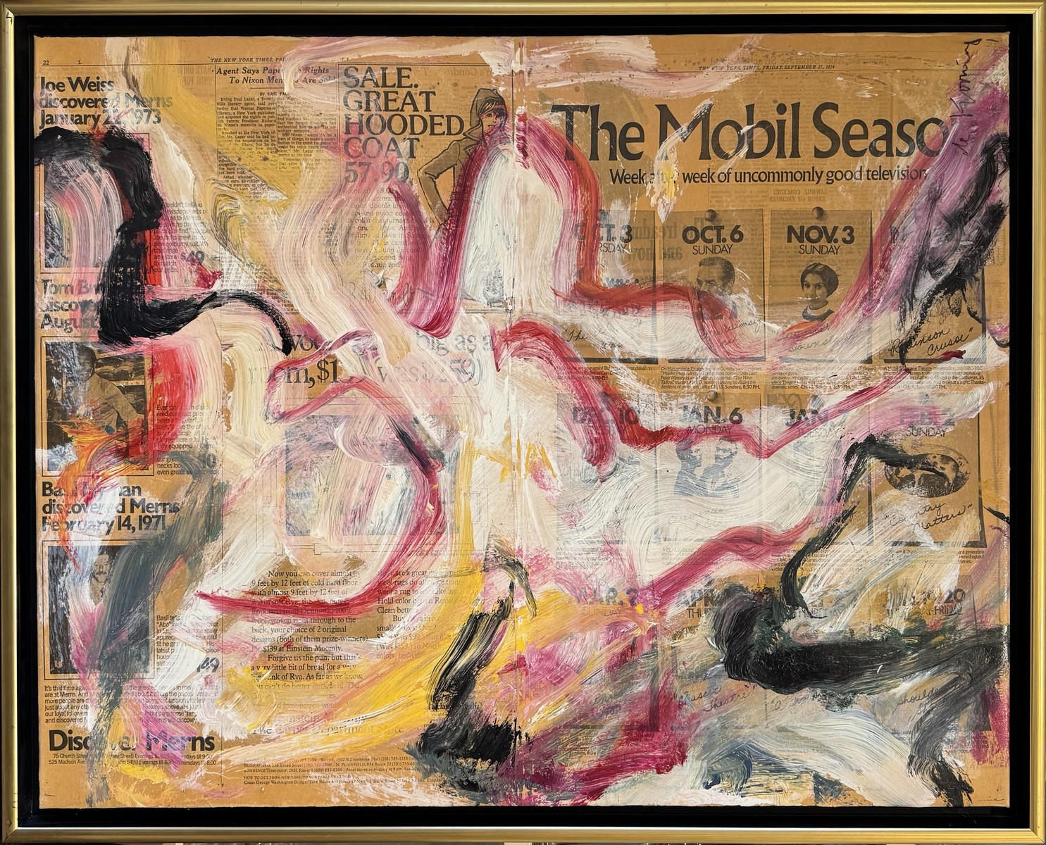 Huile sur papier journal marouflé sur toile, signé en haut à droite.