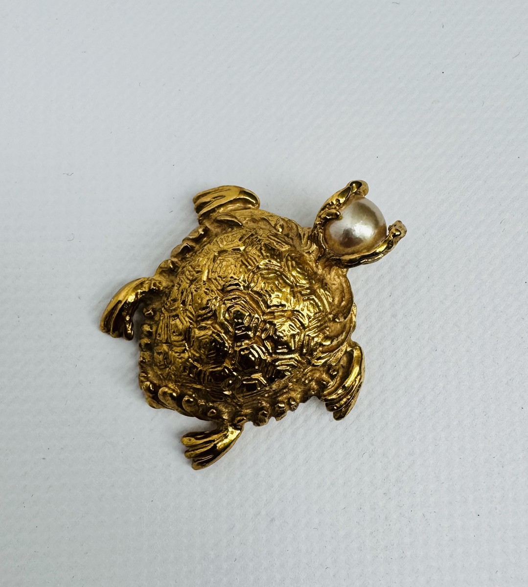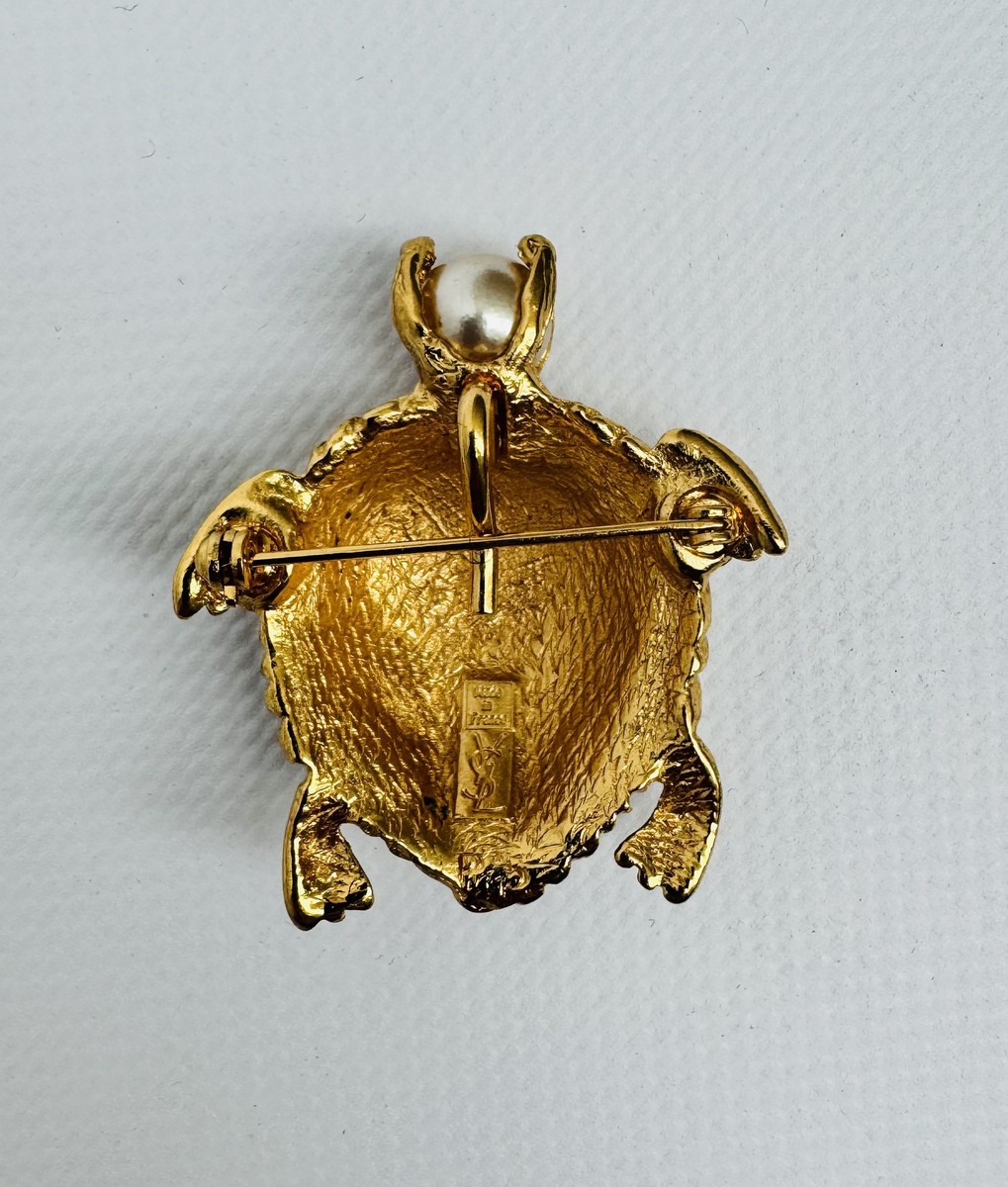 Lot 10 - YVES SAINT LAURENT. Broche-pendentif en métal doré, ciselé et perle d’imitation, figurant une tortue. Signé.